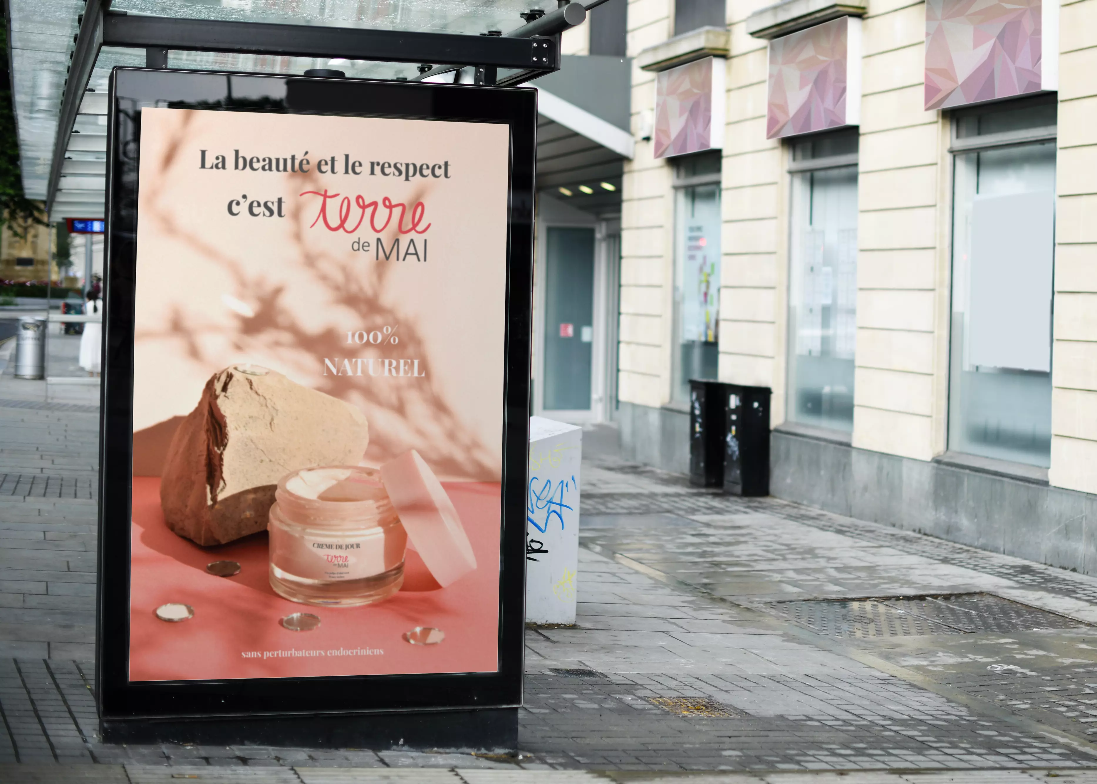 Une marque de produits cosmétiques 100% naturels, Terre de Mai, souhaite se faire connaître et transmettre ses valeurs au travers d'une campagne de publicité. La marque veut communiquer sur trois supports différents : une affiche en ville de type sucette, une annonce destinée à la presse ainsi que deux bannières web.